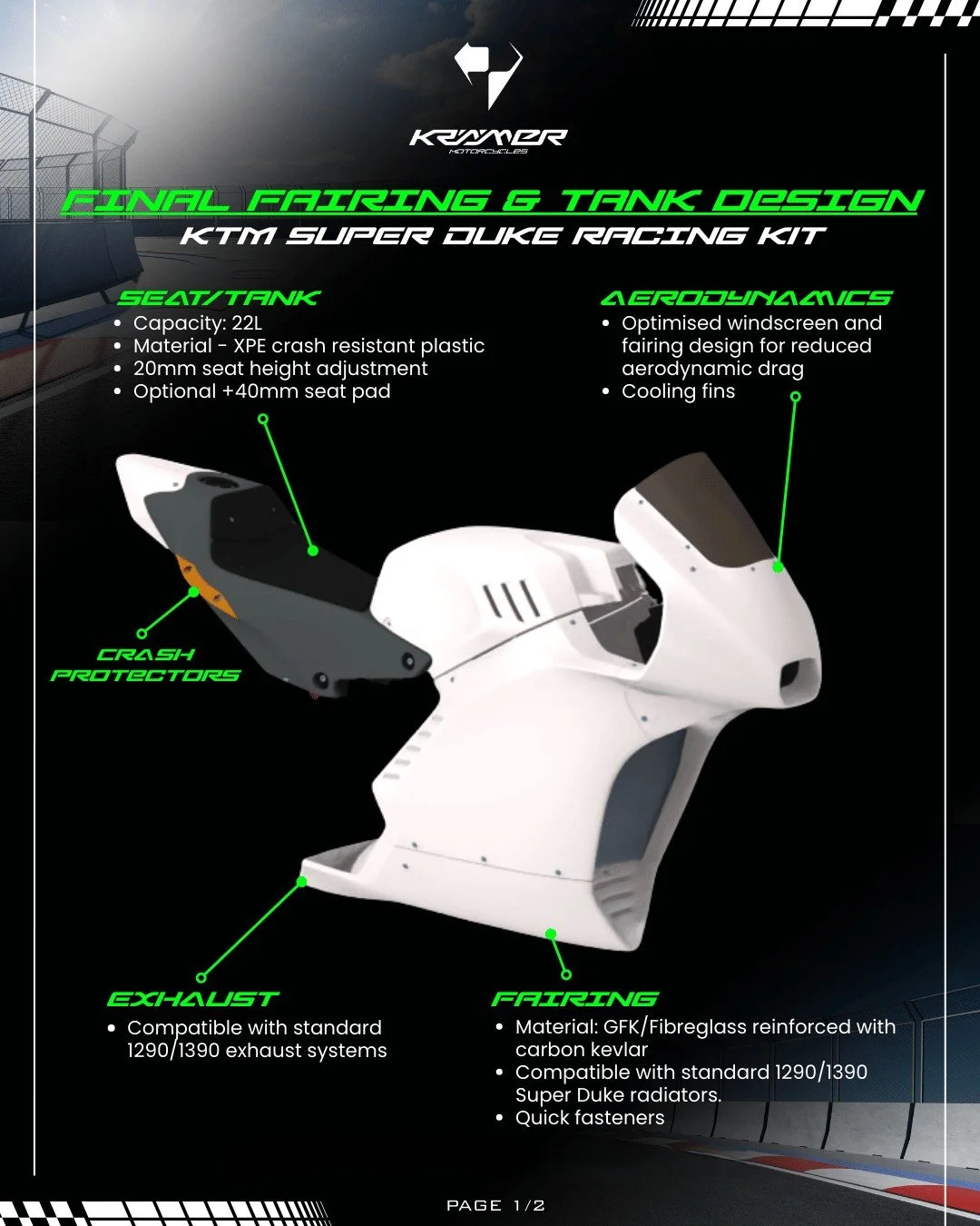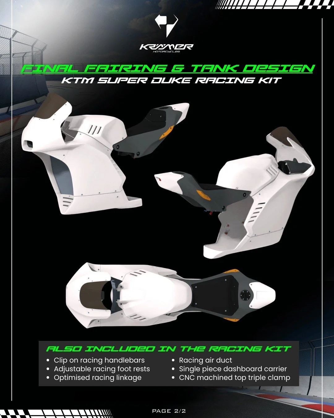 Great news for racers and track enthusiasts! The final design for the Super Duke Racing Kit has been approved, and we have entered the production phase. This comprehensive kit provides the essential components for a race-ready conversion, allowing you to optimize your current generation (2020+) Super Duke for the track.